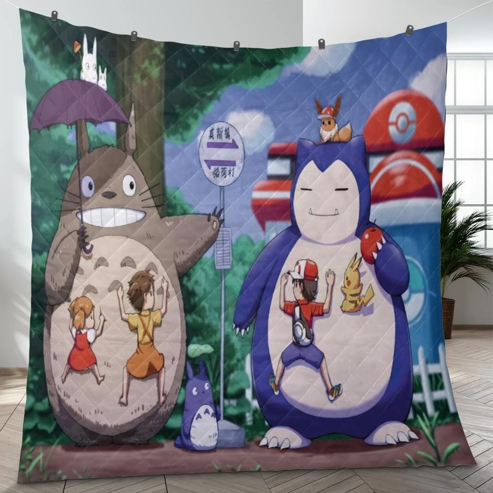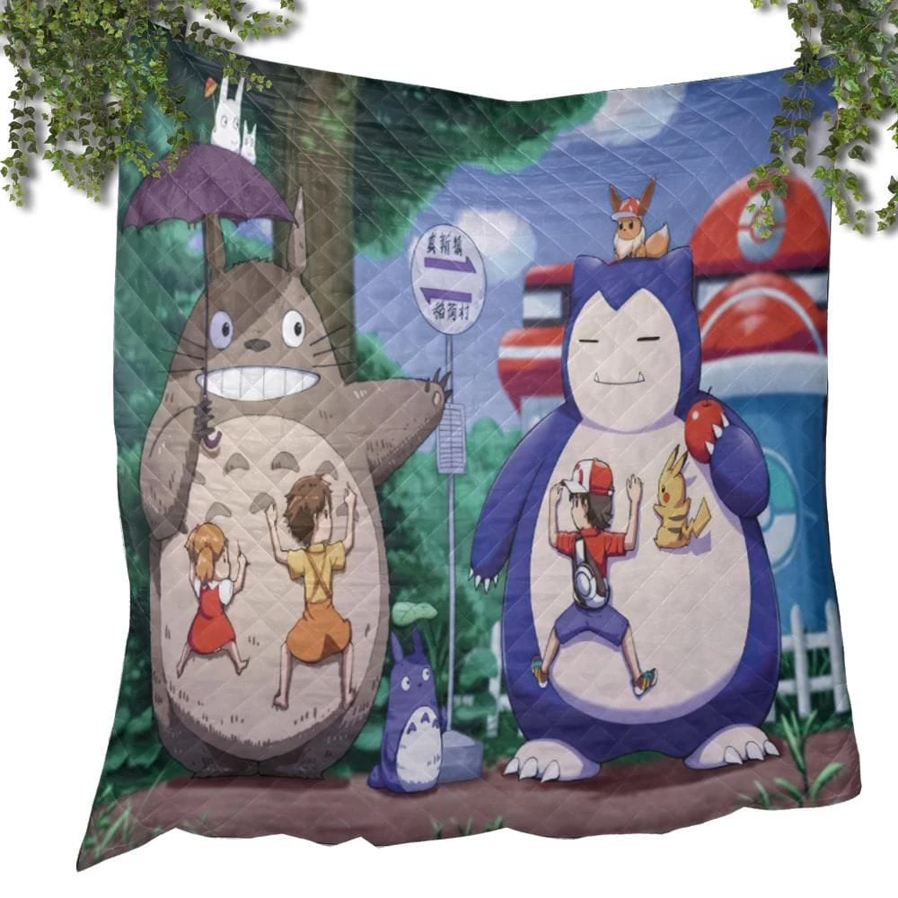 Totoro And Snorlax At The Bus Stop Quilt Blanket